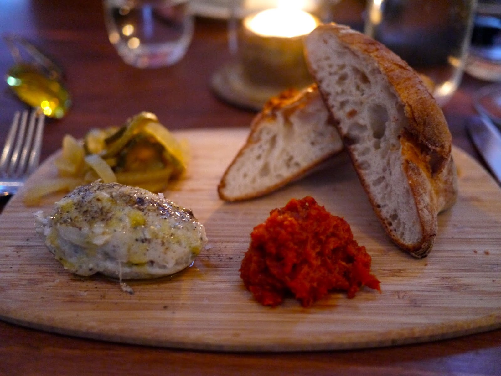 We started with “Whipped La Quercia Lardo Iberico alle-pia nduja, petit pan with zucchini bread â¨& butter pickle” which was a sort of pork based butter, to spread on hot bread & top with spicy sausage & pickles.