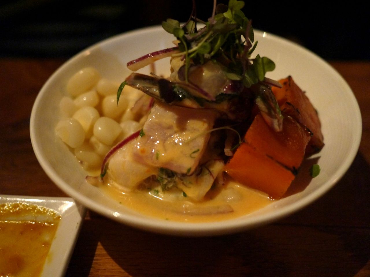 Seafood ceviche, leche de tigre, sweet potato, choclo.