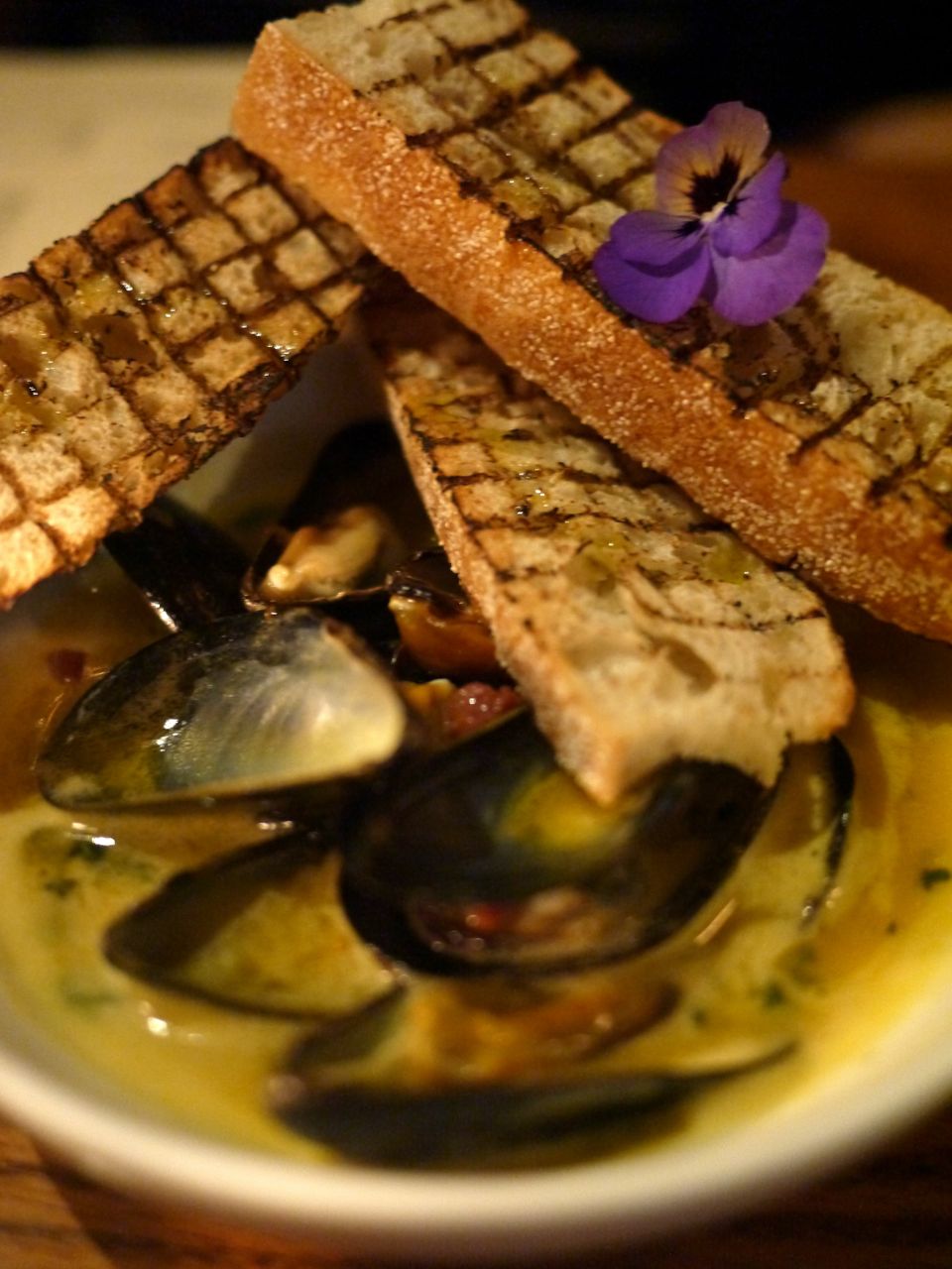 Steamed black mussels, applewood smoked bacon and aji amarillo butter. Served with sourdough, for mopping.