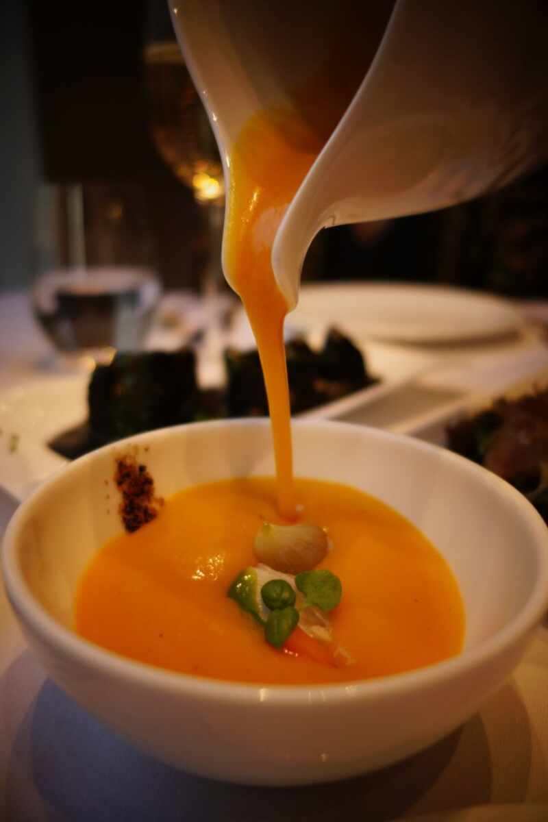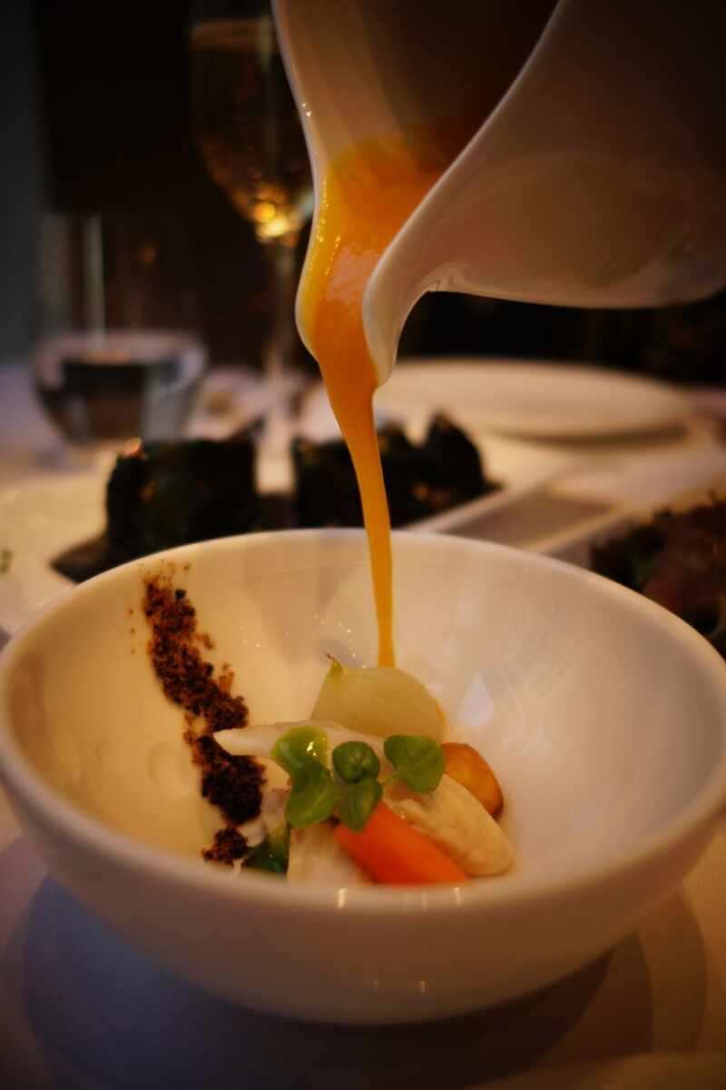 This is a pumpkin and mandarin soup, poured over pickled fish and vegetables.