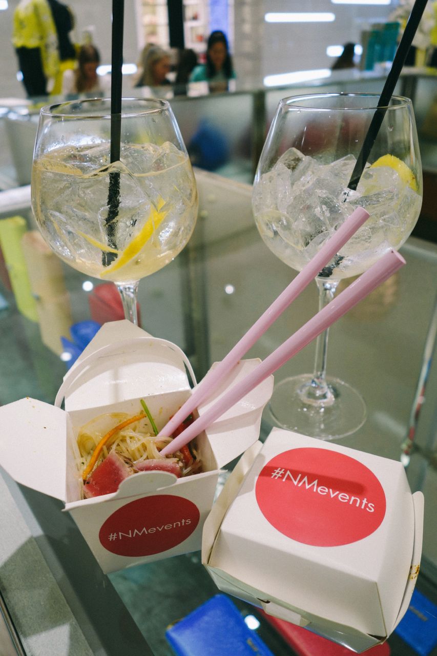 Lunch was “take-out” style. Tiny little boxes of Chinese noodles with seared tuna, mini cheeseburgers and palm sized pizza boxes. Washed down with peachy iced cocktails.