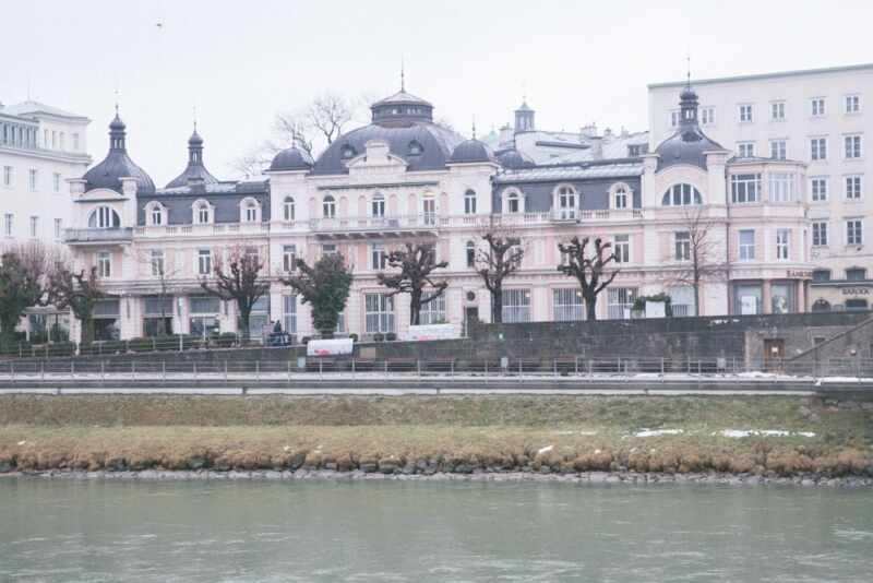 Café Bazar in all its pink wedding cake glory, looking over the river to Salzburg’s old town.
