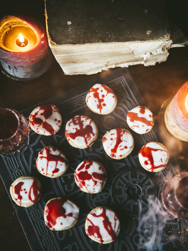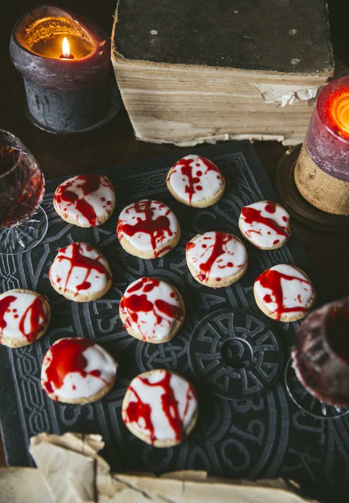 Then use a spatular or spoon to flick the “blood” all over the cookies.