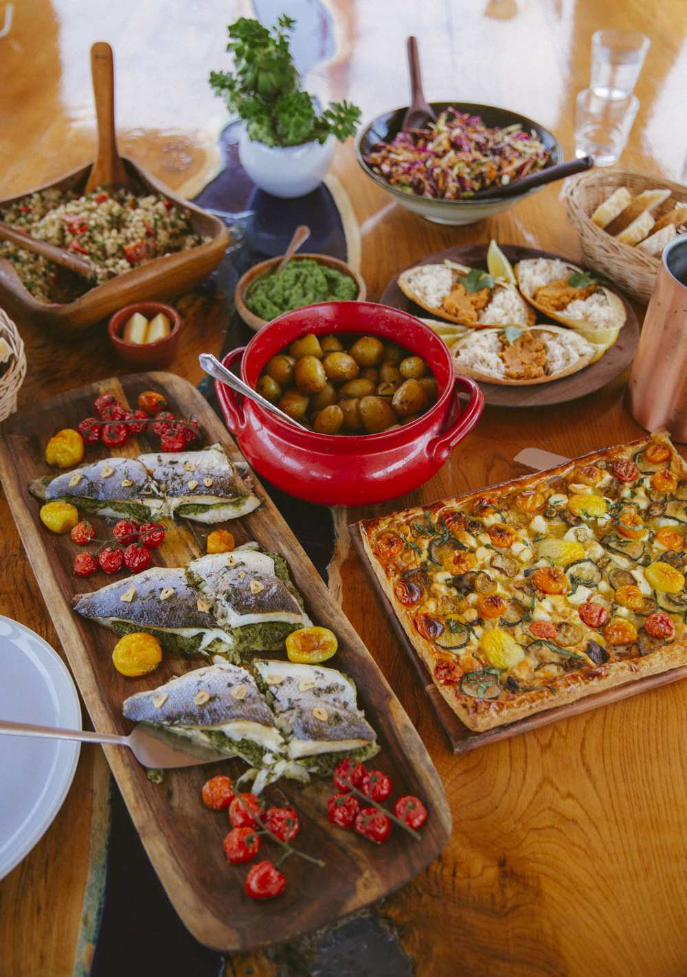 Dressed crab, hot buttered new potatoes, baked fish bursting with herbs and crispy garlic, the most beautiful summer tart, salads and homemade bread.